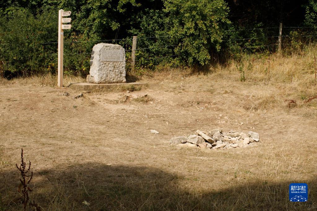 這是8月14日在英國賽倫塞斯特附近拍攝的干涸的泰晤士河發源地和一塊寫有“泰晤士河起點”的石碑。