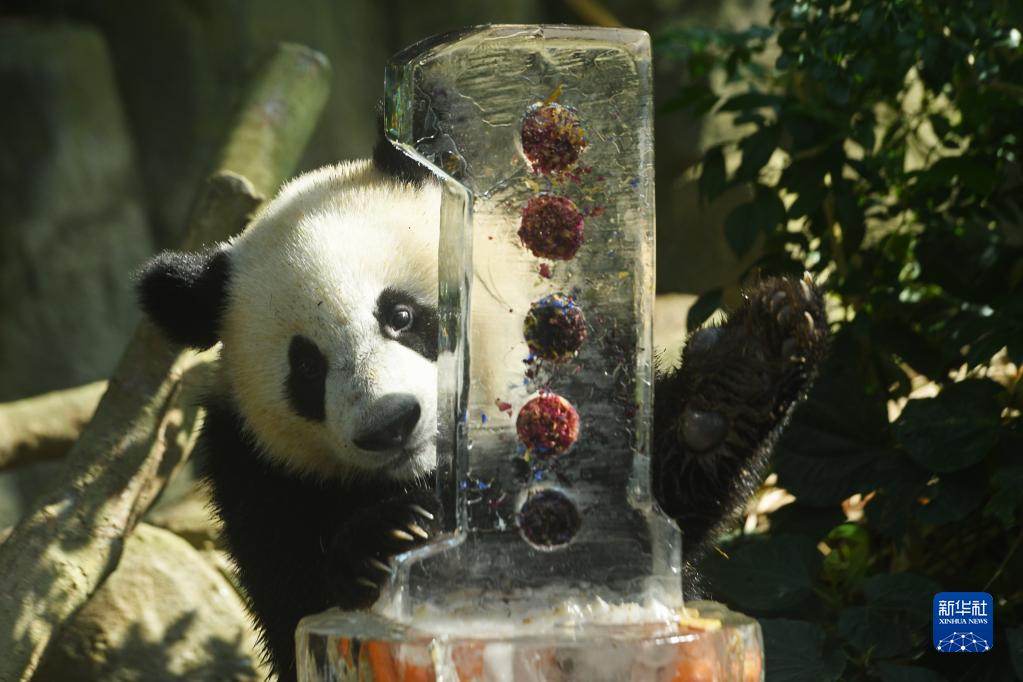 8月12日,在新加坡河川生態園,大熊貓幼崽叻叻在自己的一歲生日慶祝活動上品嘗冰塊蛋糕。
