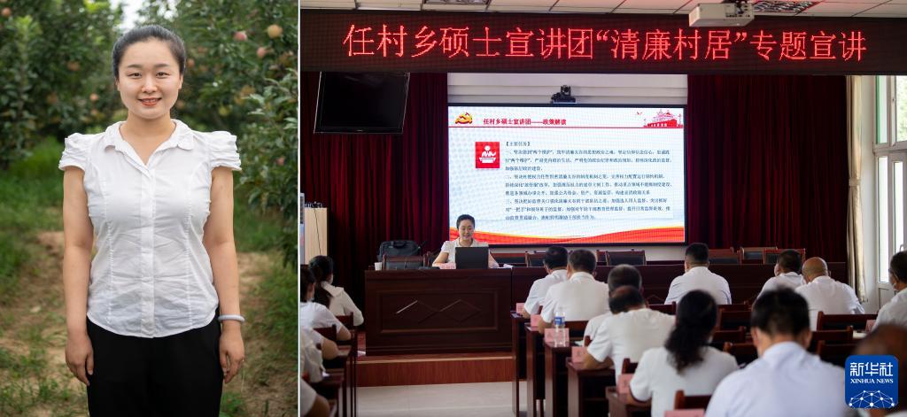 拼版照片:左圖為任村鄉碩士宣講團成員張婉玲;右圖為張婉玲在任村鄉進行宣講(8月19日攝)。