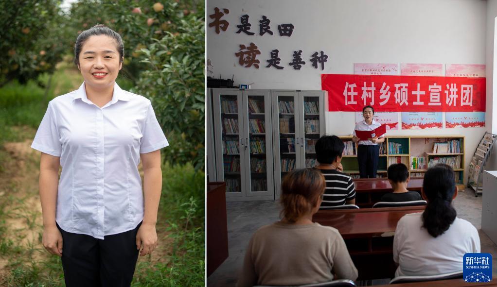 拼版照片:左圖為任村鄉碩士宣講團成員李昕瑜;右圖為李昕瑜在任村鄉東賈村進行宣講(8月19日攝)。