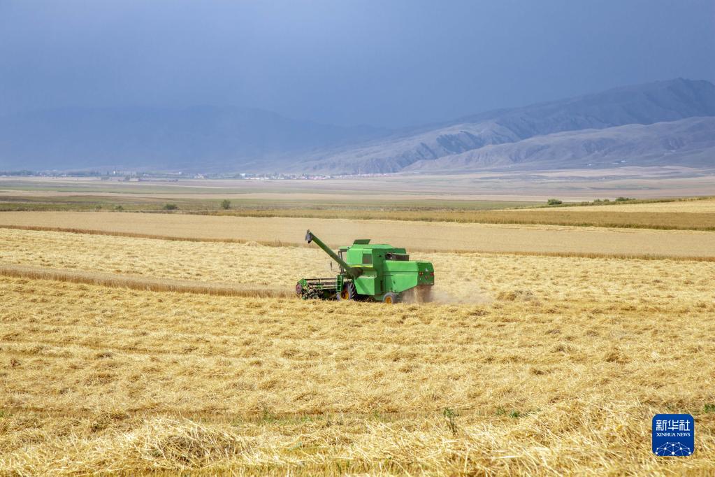 8月,新疆伊犁河谷上的昭蘇高原,連片的麥田陸續成熟,聯合收割機來回穿行忙碌,一片豐收景象。