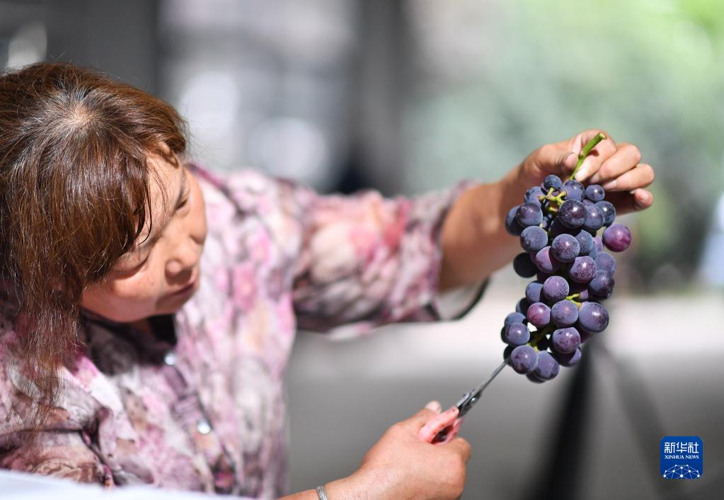 8月19日,果農在位于西安市鄠邑區的一家農業科技有限公司葡萄種植園內對即將發貨的新鮮葡萄進行修剪。