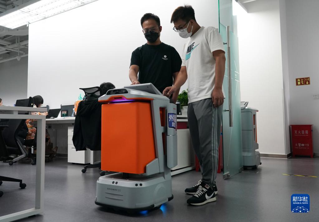 在北京市海淀區(qū)中關(guān)村東升科技園,一家商用機器人公司的工作人員在調(diào)試服務(wù)機器人(8月17日攝)。