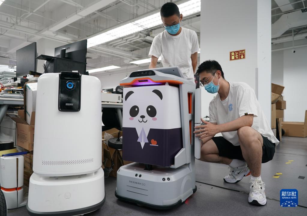 在北京市海淀區中關村東升科技園,一家商用機器人公司的工作人員在調試服務機器人(8月15日攝)。