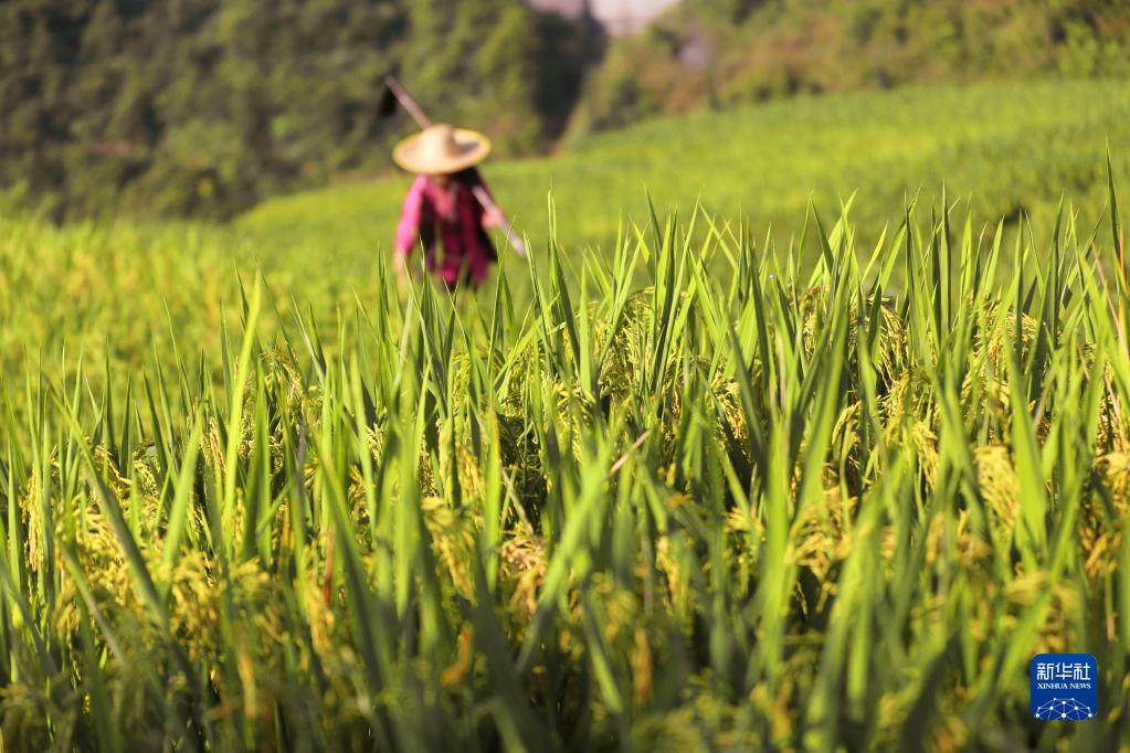 時下,貴州省丹寨縣境內稻田里的水稻由綠變黃,谷穗因飽滿而彎了腰,微風吹來,稻浪翻滾,一片豐收在望的景象。