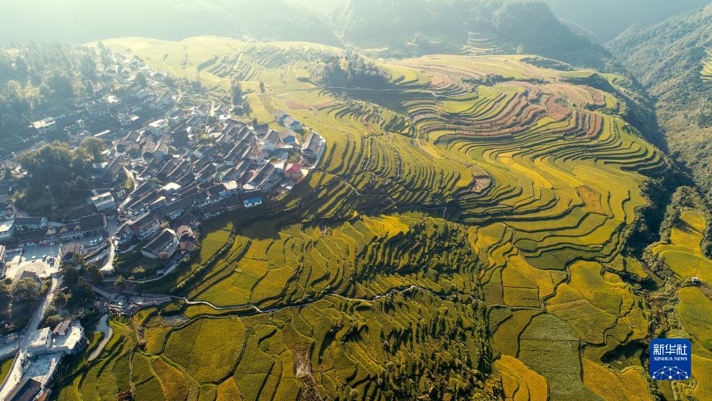 時(shí)下,貴州省丹寨縣境內(nèi)稻田里的水稻由綠變黃,谷穗因飽滿(mǎn)而彎了腰,微風(fēng)吹來(lái),稻浪翻滾,一片豐收在望的景象。