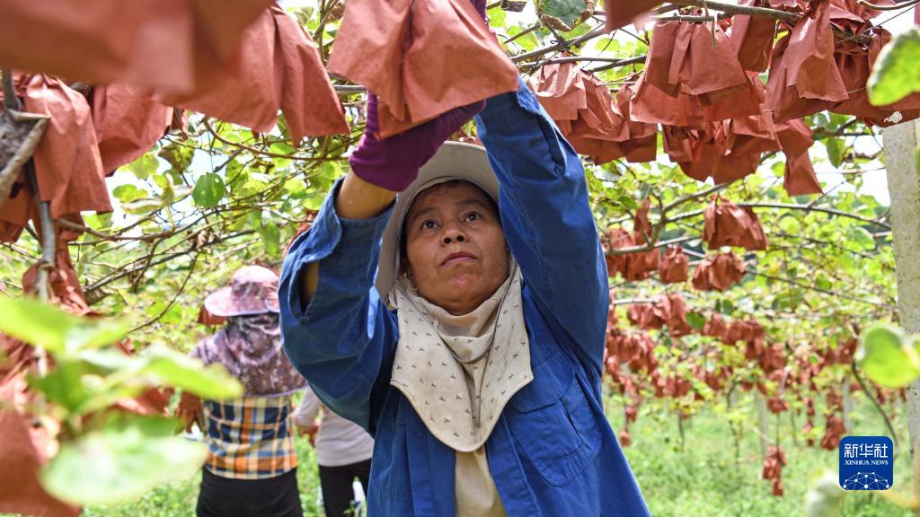 在廣西融安縣大良鎮(zhèn)石門村獼猴桃種植園,村民在采摘獼猴桃(8月20日攝)。