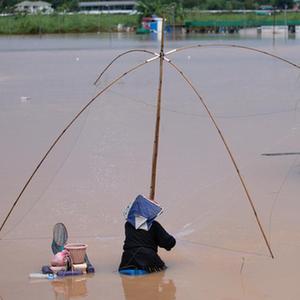 8月20日,在老撾萬象,漁民在漲水的湄公河上捕魚(無人機照片)。