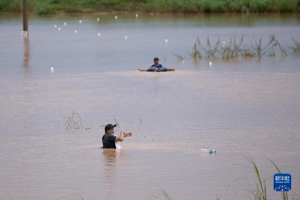 8月20日,在老撾萬象,漁民在漲水的湄公河上捕魚。