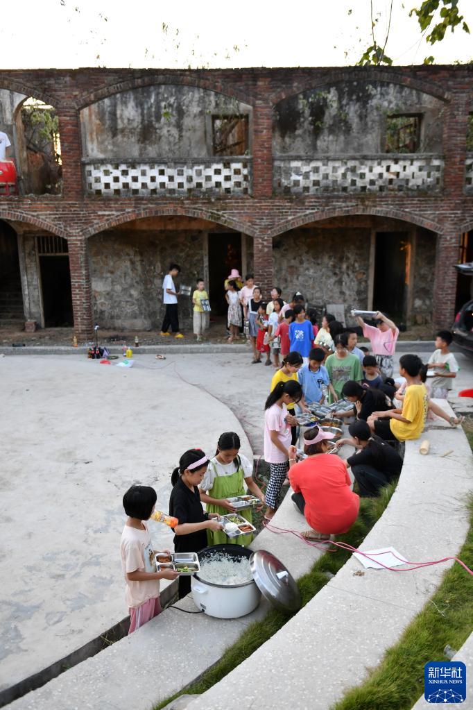 8月19日,孩子們在戲劇排練后排隊吃晚飯。