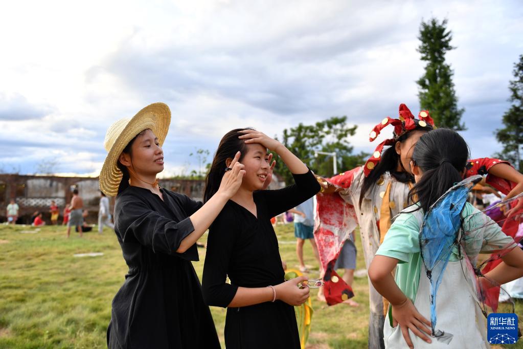 今年7月,附近村莊和鄰近縣市的70多個孩子參加了大元社的暑期活動,在完成基本學業之余,學習手工、繪畫、音樂等藝術相關課程。8月20日傍晚,孩子和村民們一起舉辦的藝術節便是“結業典禮”。為了準備藝術節的重頭戲——沉浸式戲劇,孩子們自己打磨劇本、設計服裝、調試燈光,40多個孩子穿著自己設計的服裝,期待著屬于他們的鄉村藝術節。