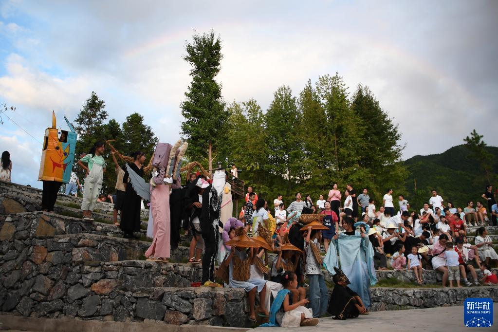 今年7月,附近村莊和鄰近縣市的70多個孩子參加了大元社的暑期活動,在完成基本學業之余,學習手工、繪畫、音樂等藝術相關課程。8月20日傍晚,孩子和村民們一起舉辦的藝術節便是“結業典禮”。為了準備藝術節的重頭戲——沉浸式戲劇,孩子們自己打磨劇本、設計服裝、調試燈光,40多個孩子穿著自己設計的服裝,期待著屬于他們的鄉村藝術節。