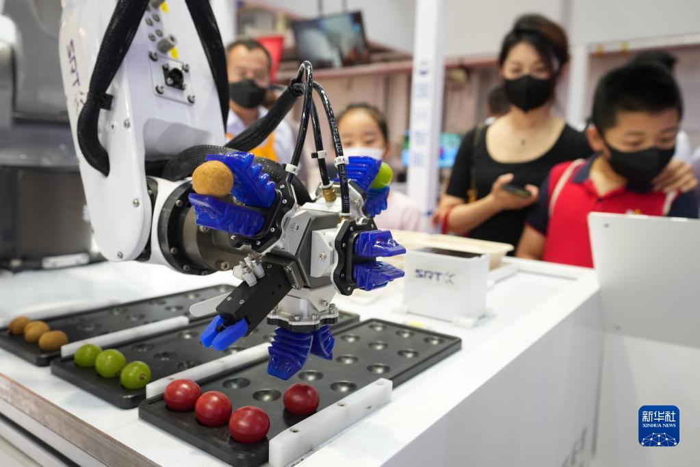 參觀者在2022世界機器人博覽會觀看軟體機器人果蔬分選平臺演示(8月19日攝)。