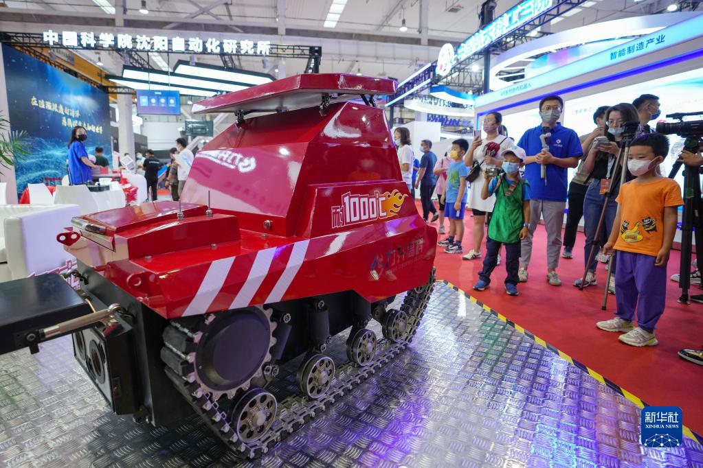 這是在2022世界機器人博覽會“機器人+應急與安全”領域展示的一款耐高溫消防滅火機器人(8月18日攝)。該機器人適用于替代消防救援人員長時間深入危險高溫火場進行火情偵察和滅火工作。