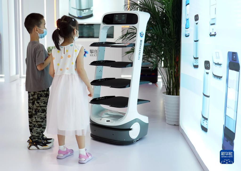這是在2022世界機器人博覽會“機器人+商用”展區現場拍攝的送餐機器人“(8月20日攝)。