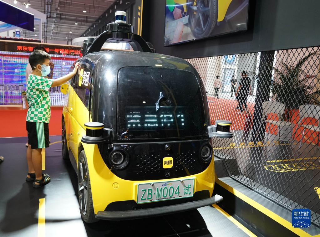 這是在2022世界機器人博覽會“機器人+物流”展區現場拍攝的自動配送車(8月20日攝)。