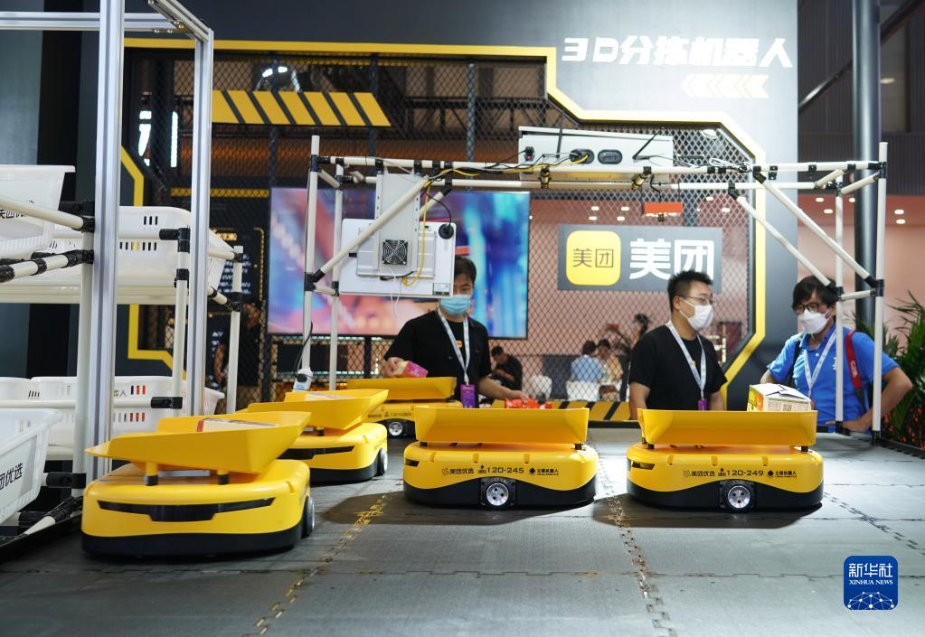 這是在2022世界機器人博覽會“機器人+物流”展區現場拍攝的3D分揀機器人(8月18日攝)。