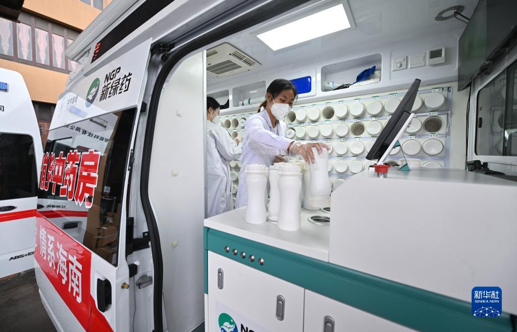 8月20日,在海南三亞一家酒店附近,工作人員在“流動應急智能中藥房”里將盛有單味中藥濃縮顆粒的藥瓶放入發藥機。