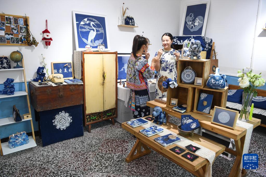 張娟娟(左)在蠟染體驗工作室里給顧客介紹自己設計的蠟染文創產品(8月18日攝)。