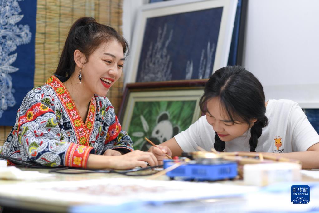 張娟娟(左)在蠟染體驗工作室里指導妹妹繪制蠟版畫(8月18日攝)。