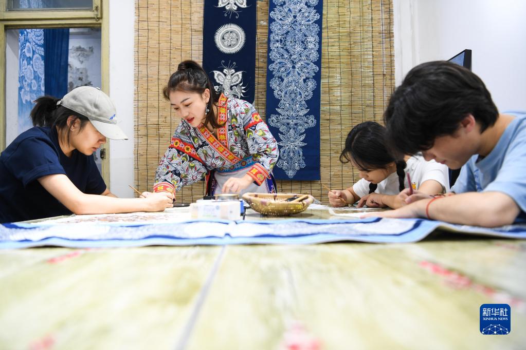 張娟娟(左二)在蠟染體驗工作室里指導親友繪制蠟版畫(8月18日攝)。
