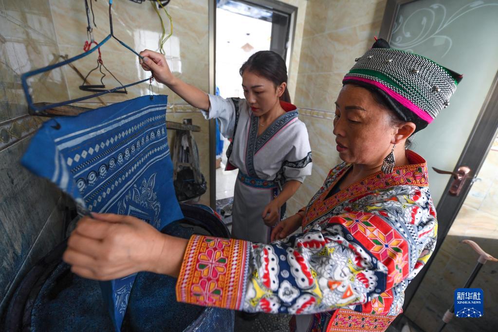 張娟娟(后)與媽媽在家里給蠟染產品染色(8月18日攝)。