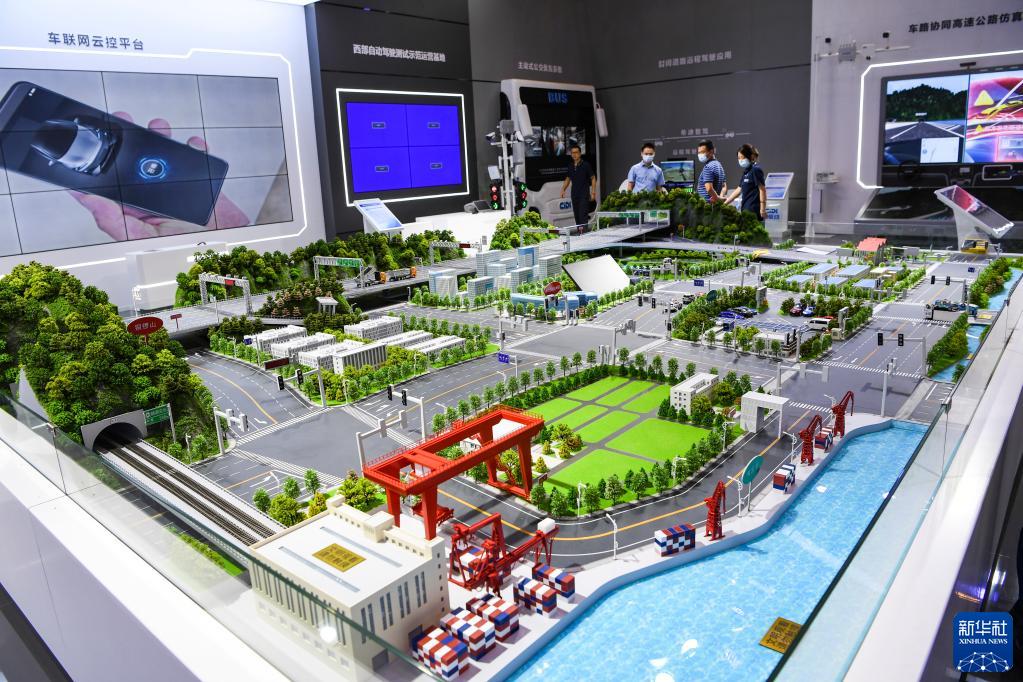 8月21日,嘉賓在2022中國(guó)國(guó)際智能產(chǎn)業(yè)博覽會(huì)會(huì)場(chǎng)上參觀車路協(xié)同沙盤。