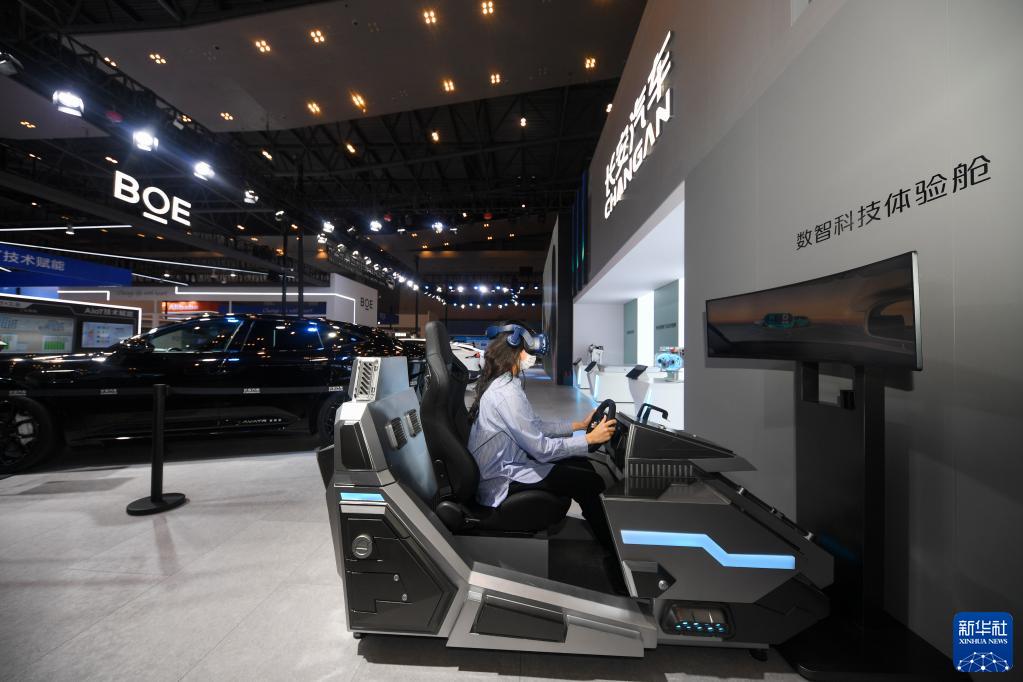 8月21日,媒體記者在2022中國國際智能產業博覽會長安汽車展廳體驗數智科技體驗艙。