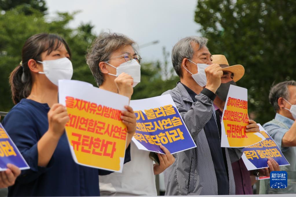 8月22日,集會(huì)者手持標(biāo)語(yǔ)牌在韓國(guó)首爾參加集會(huì)反對(duì)韓美軍演。
