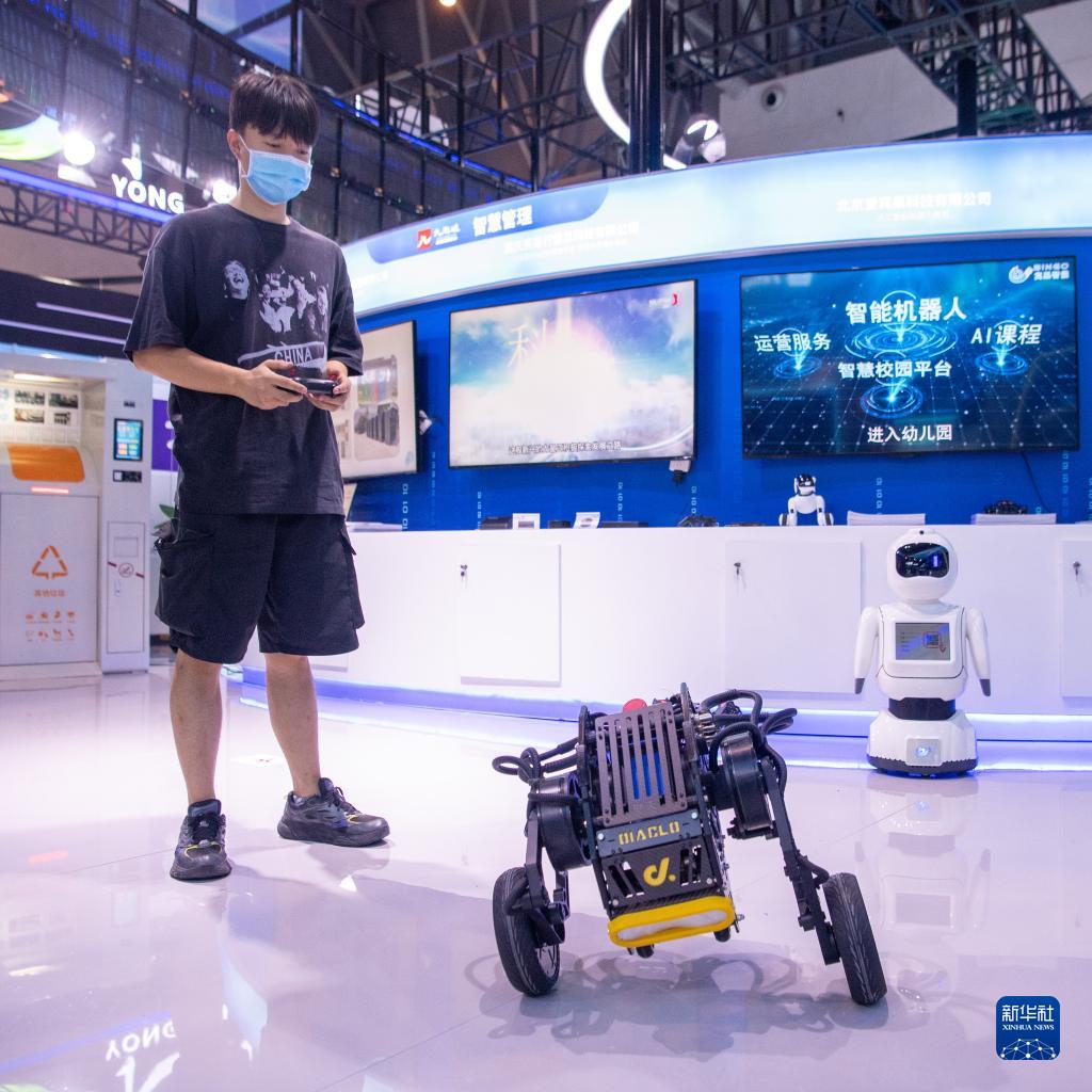 8月22日,在2022智博會重慶九龍坡區展廳,工作人員在操作雙足機器人。