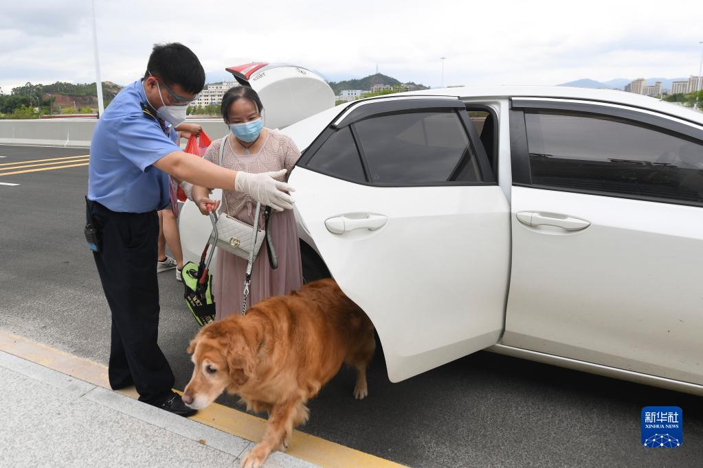 8月19日,在河源東站,客運員張金宇(左)在進站口接到了張莉和她的導盲犬滿悅。