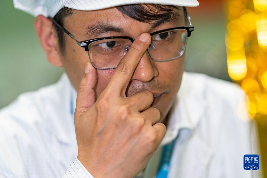 2022年8月3日,在長光衛星技術股份有限公司總裝車間,項目總師陳茂勝踏查“吉林一號”高分03衛星生產工作。