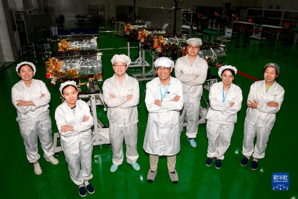 這是在長光衛星技術股份有限公司總裝車間內拍攝的項目總師陳茂勝(右四)與部分團隊成員(2022年8月3日攝)。