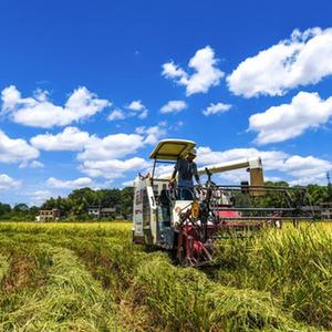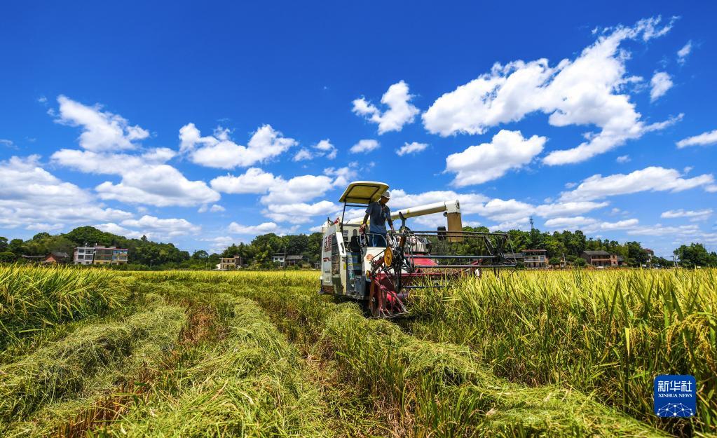 8月22日,湖南省常寧市勝橋鎮港子口村農民駕駛收割機收割水稻。