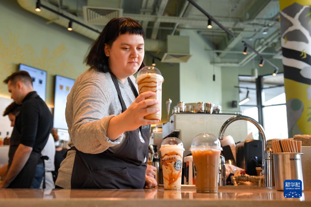 8月22日,工作人員在俄羅斯莫斯科一家“星咖啡”門店為顧客準(zhǔn)備飲品。