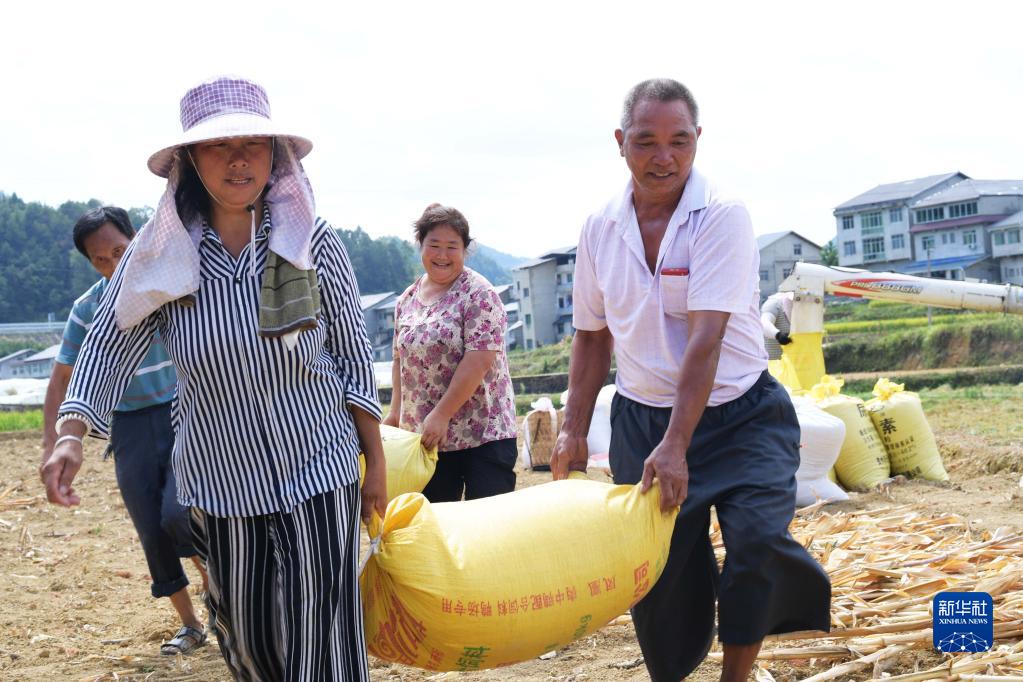8月23日,村民在貴州省綏陽縣旺草鎮萬畝大壩搬運剛搶收的稻谷。