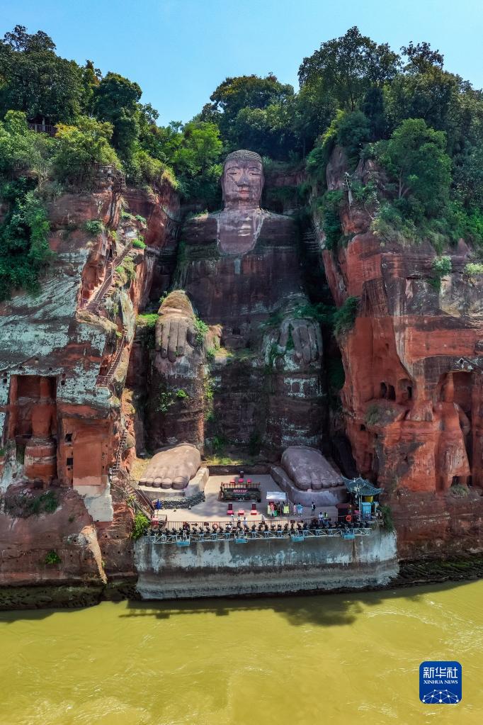 這是8月23日拍攝的露出底座的樂山大佛(無人機照片)。