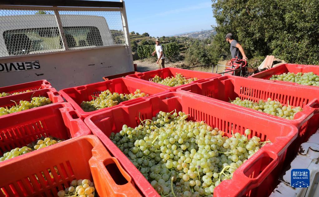 8月23日,在法國尼斯一家酒莊的葡萄園,收割的葡萄靜置一旁。