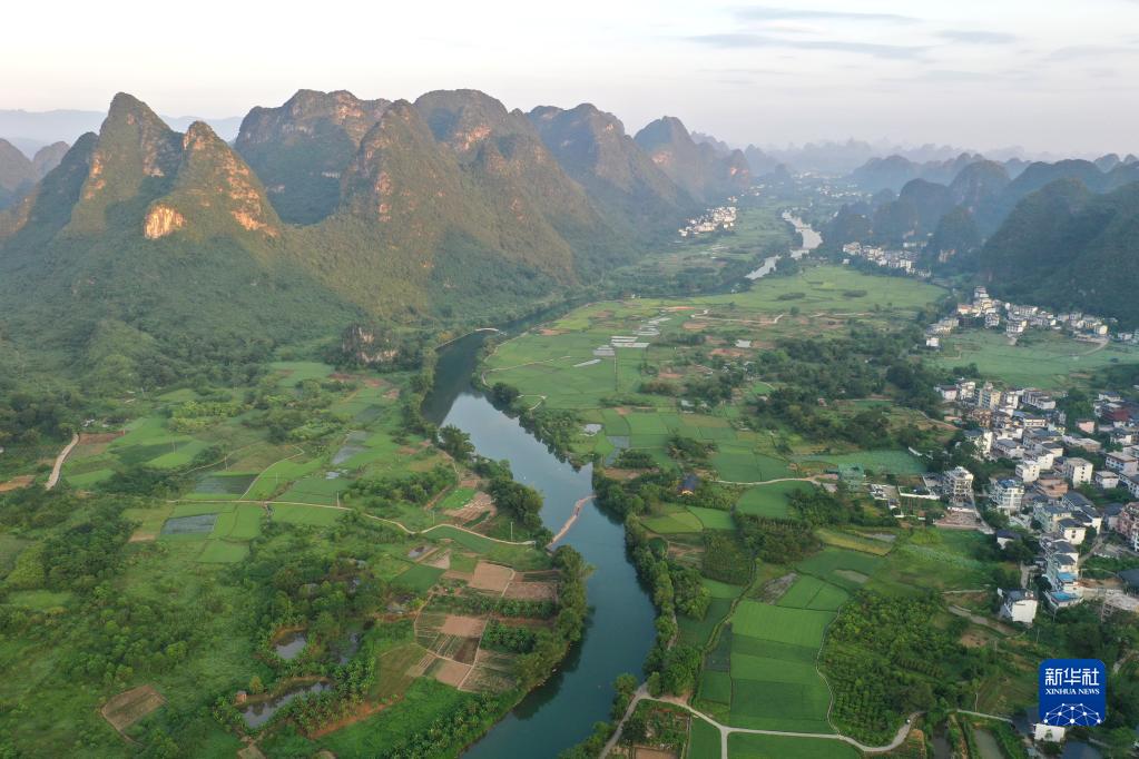 時下,廣西桂林市陽朔縣遇龍河沿岸山清水碧,草木蔥郁,在藍天白云掩映下,一派生機盎然景象。
