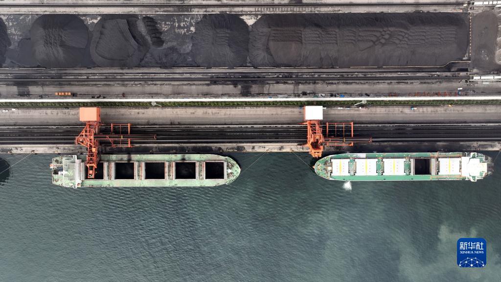 8月25日,在唐山港曹妃甸港區,裝船機在進行煤炭裝船作業(無人機照片)。