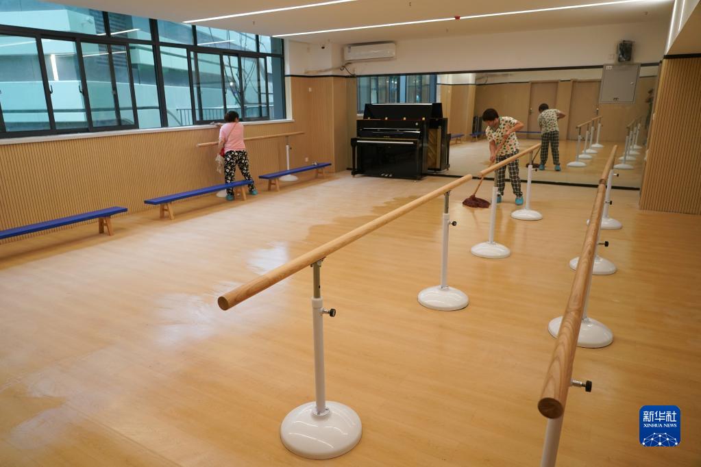 8月25日,在新建成的西安市雁塔區(qū)第一小學(xué)的一間舞蹈教室內(nèi),保潔人員在打掃衛(wèi)生。
