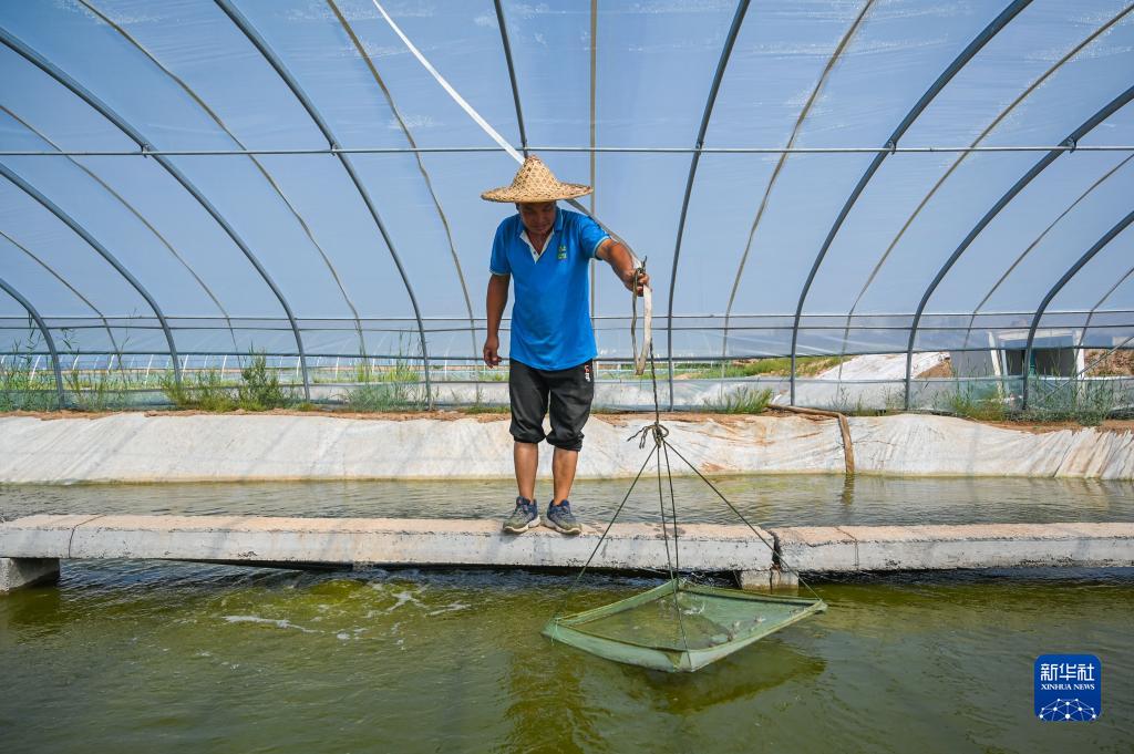 8月25日,鹽堿水對蝦養殖園區工作人員查看對蝦生長情況。