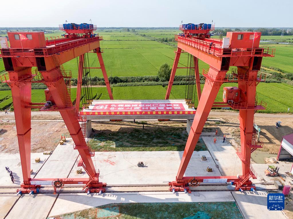 8月25日拍攝的滬渝蓉高鐵天門(mén)段首榀箱梁架設(shè)現(xiàn)場(chǎng)(無(wú)人機(jī)照片)。
