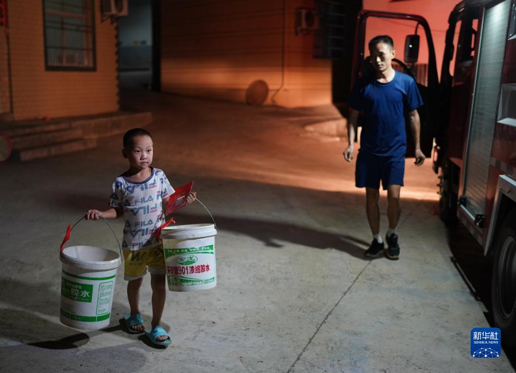 消防員來到瑞昌市范鎮(zhèn)上源村送水,一名小孩拿著水桶準(zhǔn)備接水(8月23日攝)。