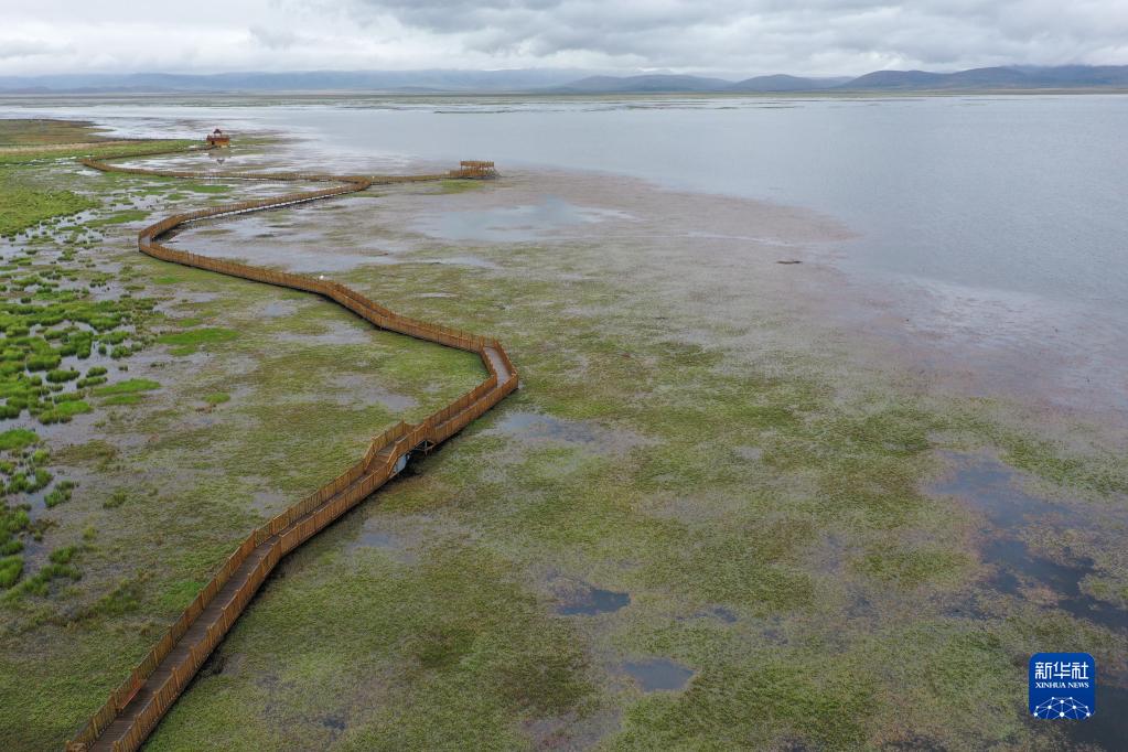 這是在甘肅省甘南藏族自治州碌曲縣拍攝的尕海湖(無人機照片,2021年6月2日攝)。新華社記者 杜哲宇 攝