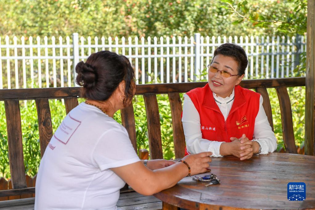 8月24日,吳亞琴(右)與團(tuán)山街道長山花園社區(qū)的樓棟黨支部書記李杰聊天。新華社記者 張楠 攝
