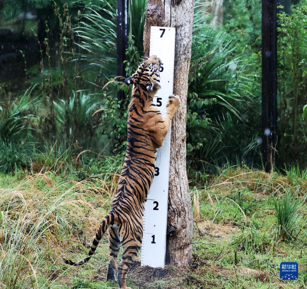 8月25日,在英國倫敦動物園,一只蘇門答臘虎爬上身高標尺。