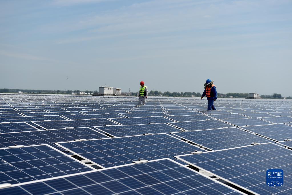 8月25日,運維人員在潁上縣毛圩水上光伏電站進行巡檢。