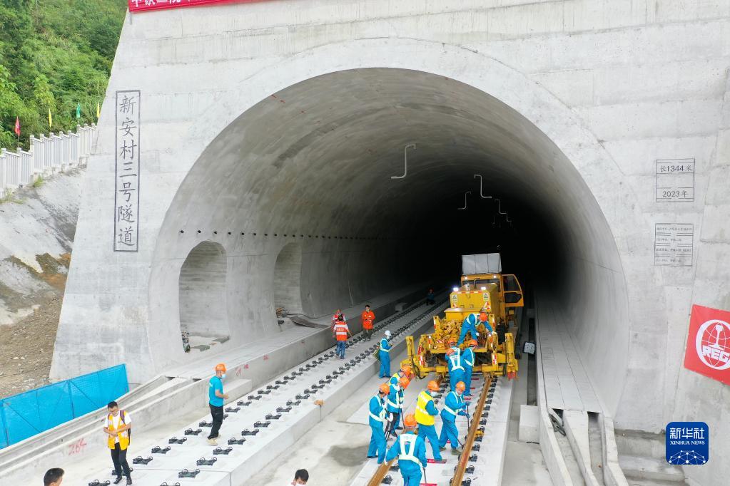 8月26日,中鐵一局建設者們在進行鋪軌施工(無人機照片)。
