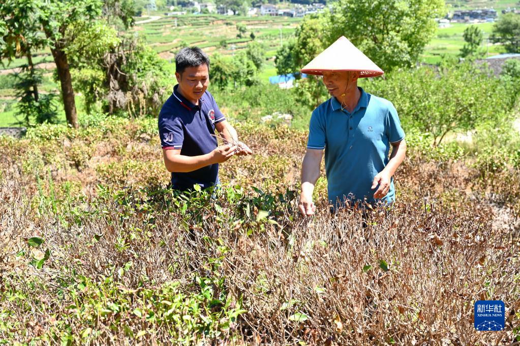 8月25日,寧德市霞浦縣牙城鎮棗嶺村黨支部書記雷大明(左)向茶農黃鴻錫了解茶葉高溫干旱受損情況。
